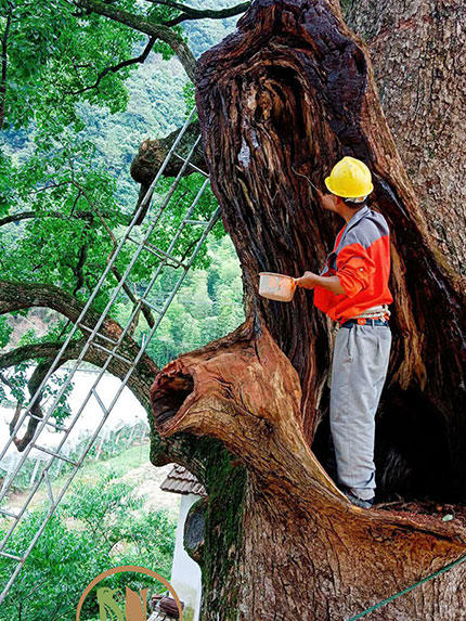 4)防治病蟲害。古樹衰老,容易招蟲致病,加速死亡。北京天壇公園因抓緊防治天牛,保護了古柏。他們的經驗是:掌握天牛每年三月中旬左右要從樹內到樹皮上產卵的時機,往古柏上打223乳劑,工人稱為“封樹”。